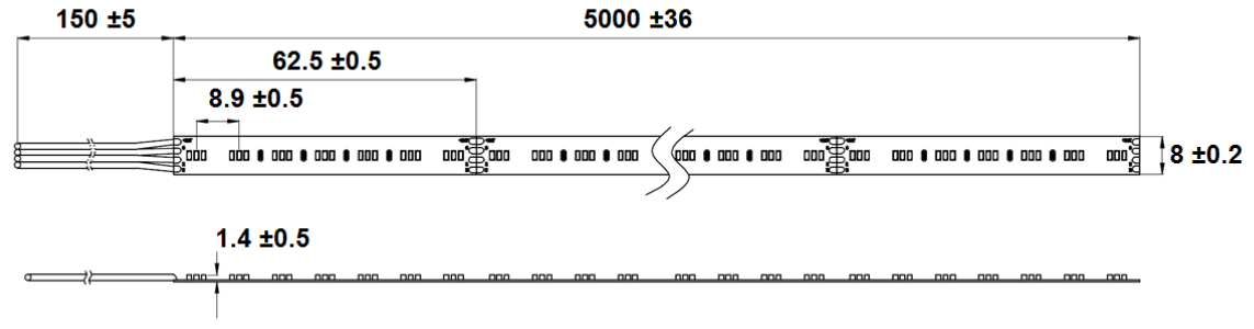 Bei längeren Zuleitungen tritt ebenfalls ein Spannungsabfall auf. In Installationen sollte für einen ausreichenden Kabelquerschnitt gesorgt werden. Die an den Bändern angelöteten Kabel sind so bemessen, dass bei ihrer Benutzung bei maximaler Länge die Helligkeit an der Einspeisung in das Band um ca. 5% sinken kann.